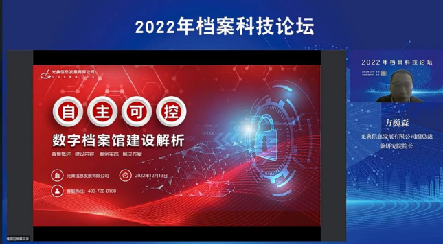 光典信息发展有限公司(简称“光典”)副总裁、研究院院长方巍森受邀参加,并以《自主可控数字档案馆建设解析》为主题,发表了相关学术报告。